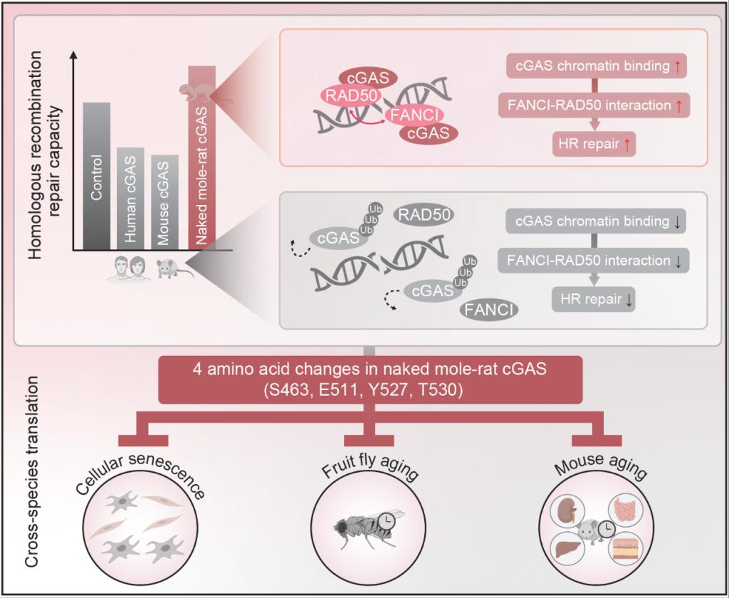 早在2018年,毛志勇教授团队与同济大学医学院、附属上海市肺科医院戈宝学教授团队合作发现人类cGAS蛋白在DNA损伤后会入核并抑制同源重组修复,导致基因组不稳定。基于此合作研究,研究团队发现裸鼹鼠cGAS的功能发生颠覆性逆转——它可显著提升同源重组修复效率。
