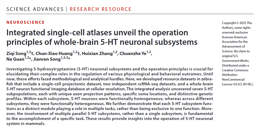 12月12日,同济大学医学院/附属上海市第四人民医院宋建人团队在《科学进展》(Science Advances)杂志上发表了题为“Integrated three single-cell atlases unveil the operation principles of whole-brain 5-HT neuronal subsystems in zebrafish”的研究成果。该研究以斑马鱼为实验模型,通过对投射、转录和功能图谱的综合分析,发现全脑内存在七个5-HT神经元亚群。每个5-HT亚群作为独立的功能模块,参与多种生理或行为过程,此外,完成特定任务需要多个平行的5-HT亚群的协调参与。该研究不仅解析了全脑5-HT神经元系统调控生理和行为状态的运行原理,也为5-HT功能障碍相关疾病的治疗策略提供了新思路。