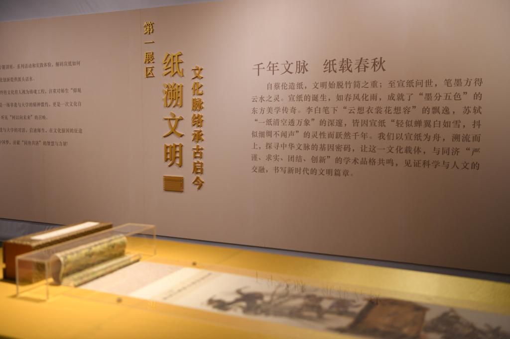 3 月 21 日下午,由同济大学、上海高校中华优秀传统文化育人联盟、中国宣纸博物馆共同主办的“‘纸’道千年亦非常 —— 人类非物质文化遗产宣纸主题展” 在同济大学博物馆一楼大厅揭幕。校党委副书记曹静,中国宣纸股份有限公司(宣纸博物馆)总经理朱大国,上海市教卫工作党委宣传处、上海高校中华优秀传统文化育人联盟相关负责人及师生代表出席活动。
